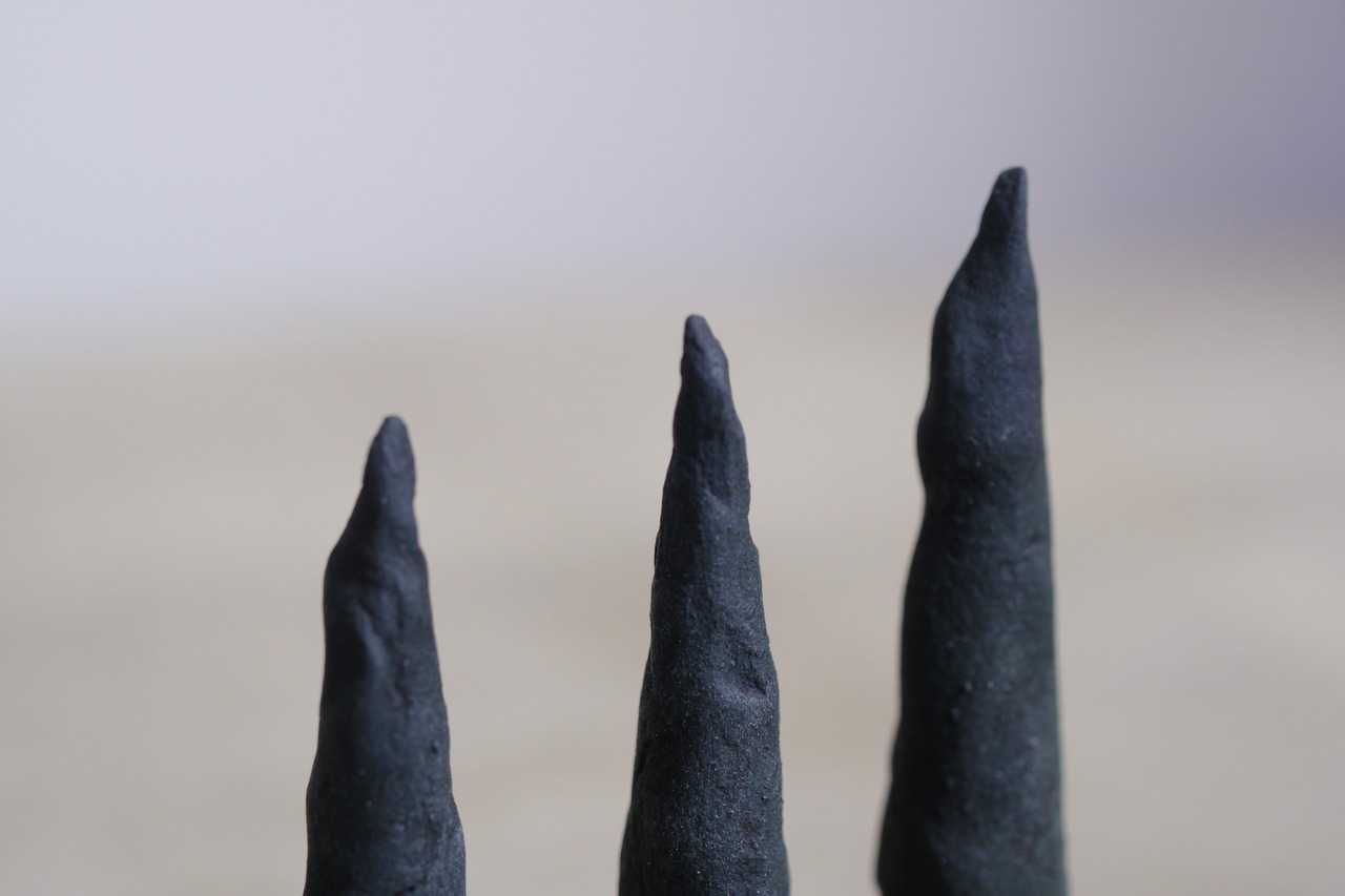 素材: 石粉粘土、鉱石粉末、アクリル、岩絵具粉末、メディウム、補強鉄棒